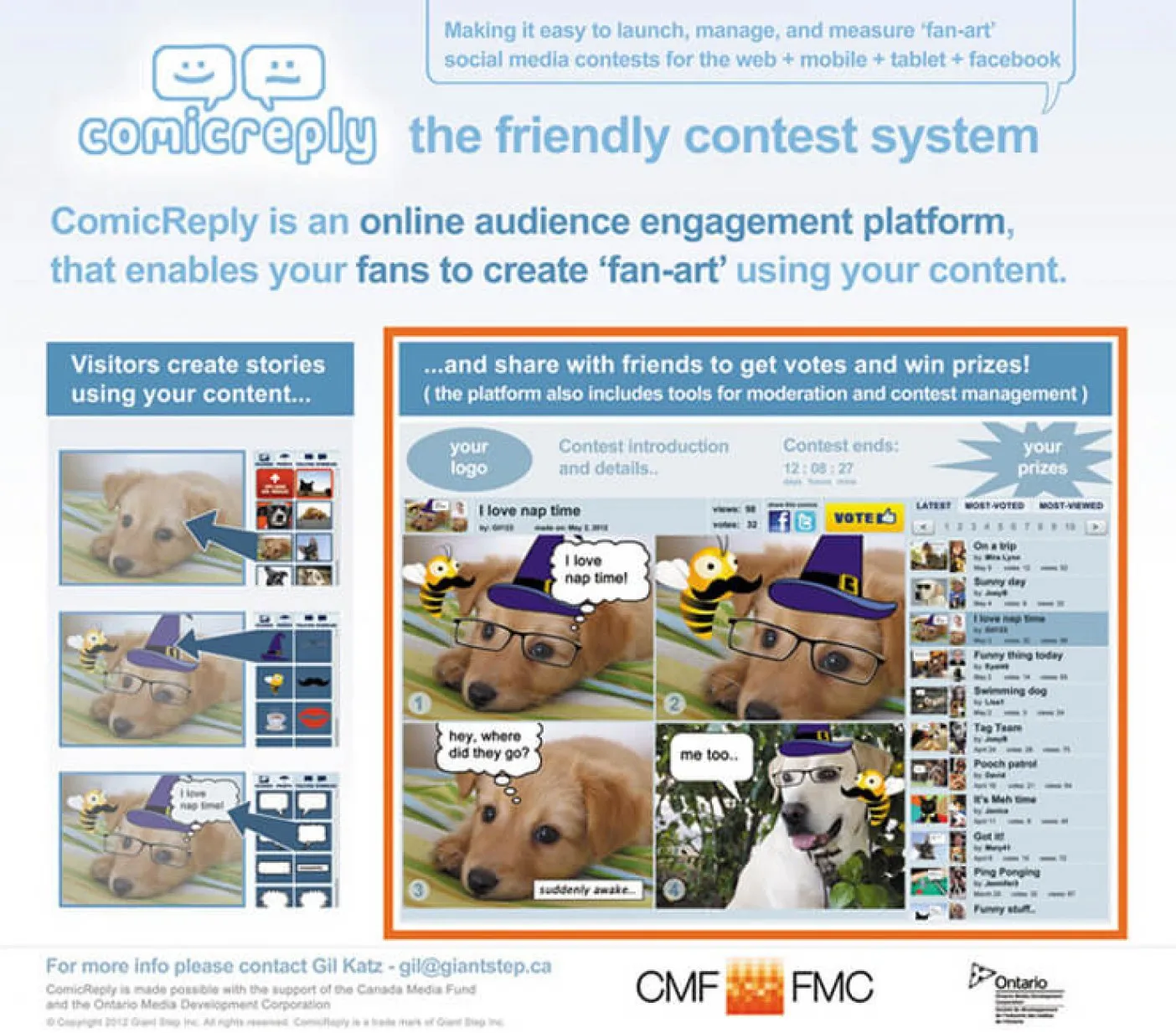 Giant Step launches ComicReply™ beta product at the Ontario Pavilion, 2012 Annecy International Animation Film Market (Mifa) conference. The Ontario Exports trade mision to Annecy is also supported by the Ontario Media Development Corporation (OMDC) Interactive Digital Media (IDM) Export Fund. June 2012 / Annecy, France Giant Step launches the ComicReply™ beta platform at the International Animation Film Market (MIFA) Giant Step, a leading Canadian digital media developer announces the launch of the ComicReply™ beta, an online contest platform that enables content producers and brands to leverage the power of online ‘fan-art’ in a contest format. Focused on moving beyond photo and video contests, the ComicReply™ platform enables the creation of branded personalized multimedia ‘fan-art’ such as branded comics, where fans can create their own stories using images from a film, TV show or a brand’s original content elements. Fans select a background image, add props, talking bubbles and submit their creation to the contest. Submissions are moderated and then posted onto a public gallery for audiences to ‘Watch & Vote’. At the end of the contest period, creators of the most-voted ‘fan-art’ win prizes. As participants share their creations with family and friends, they accumulate votes while the brand […]