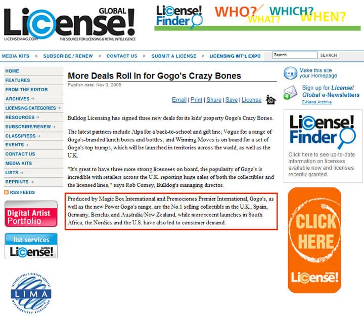 “Gogo’s are the No.1 selling collectible in the U.K., Spain, Germany, Benelux and Australia/New Zealand”, GlobalLicense! Magazine >>