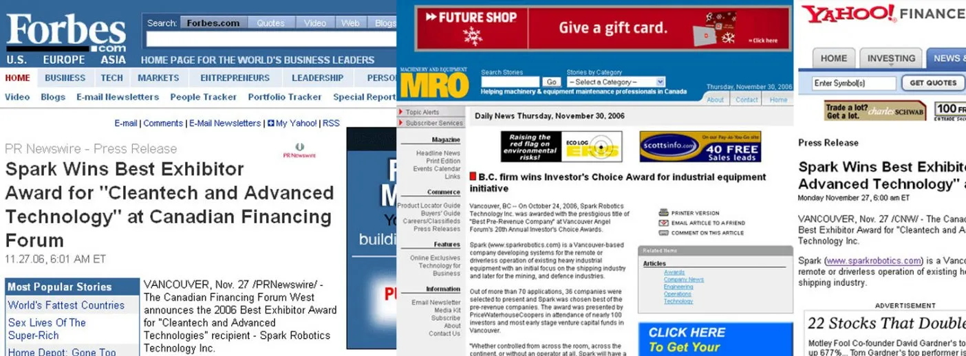 Investor Relations (IR) Media Campaign CLIENT SPARK ROBOTICS TECHNOLOGIES INC. LAUNCHED 2007 Visit The Site HIGHLIGHTS * A platform developer for robotic control systems * Won two awards at Vancouver investment forums * Seeked to secure a second round of funding * Strategic press was developed for select media * Picked up by Forbes.com, Yahoo! Finance and more * Second round of private equity financing secured ABOUT THE PROJECT Spark Robotics Technology Inc. develops systems for the remote or driverless operation heavy industrial equipment. Spark's DIOS™ - Distributed Intelligent Operating Schema™ is an enabling platform for robotic control systems. Initially focussed on applications in the defence and security sector, Spark is developing intelligent robotic controls to suport mine detection among other applications. In 2006, Spark was seeking to secure a second round of funding for the company. On October 24th, Spark won the Investor's Choice Award for "Best Pre-Revenue Company" at the Vancouver Angel Forum. Only a few weeks later, Spark won the "Best Exhibitor Award for Cleantech and Advanced Technologies" at the Canadian Financing Forum. With two investment awards won within the span of one month, Spark approached Giant Step to spread the word in the investment and business […]