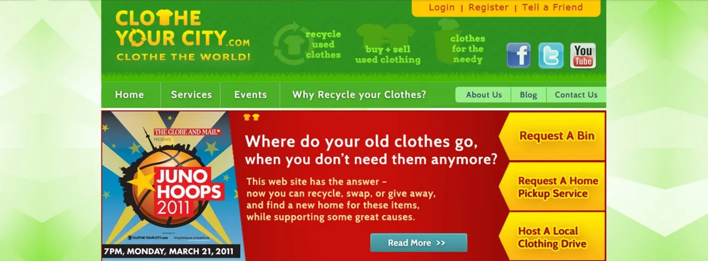 Clothes Recycling & Swapping Site CLIENT CLOTHE YOUR CITY LAUNCHED 2011 Visit The Site HIGHLIGHTS * Created the online presence for a clothes recycling company * Designed the corporate identity, logo, website, business cards, promotional flyers, poster, T-shirt and other marketing collateral * Created a basic online clothes-swapping system Note: the site is being updated and maintained by another company