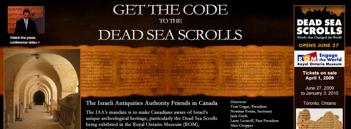 Campaign Website for Museum Exhibit CLIENT ISRAEL ANTIQUITIES AUTHORITY (IAA) - FRIENDS IN CANADA LAUNCHED 2009 Visit The Site HIGHLIGHTS * IAA Friends in Canada web site * Designed to support fundraising & ticket sales * Used for the Dead Sea Scrolls exhibit at the Royal Ontario Museum (ROM) ABOUT THE PROJECT The ROM’s Dead Sea Scrolls Project builds bridges between the past and present unlike ever before at the Museum. In partnership with the Israel Antiquities Authority, the ROM is exhibiting 17 Dead Sea Scrolls, of which four are on public display for the first time ever, having been conserved at the ROM’s request. The Dead Sea Scrolls are widely considered among the greatest archaeological finds of the past century. They include the earliest written sources for the Hebrew Bible (Christian Old Testament), as well as other less well known writings. Many of the ideas and beliefs contained in this collection of ancient parchments have resonated through the centuries and remain influential today. Indeed, they reflect the foundations of important religions such as Judaism and Christianity and have influenced Islam. Dating from around 250 Before Common Era (BCE) to 68 Common Era (CE), the Scrolls include some 207 biblical […]