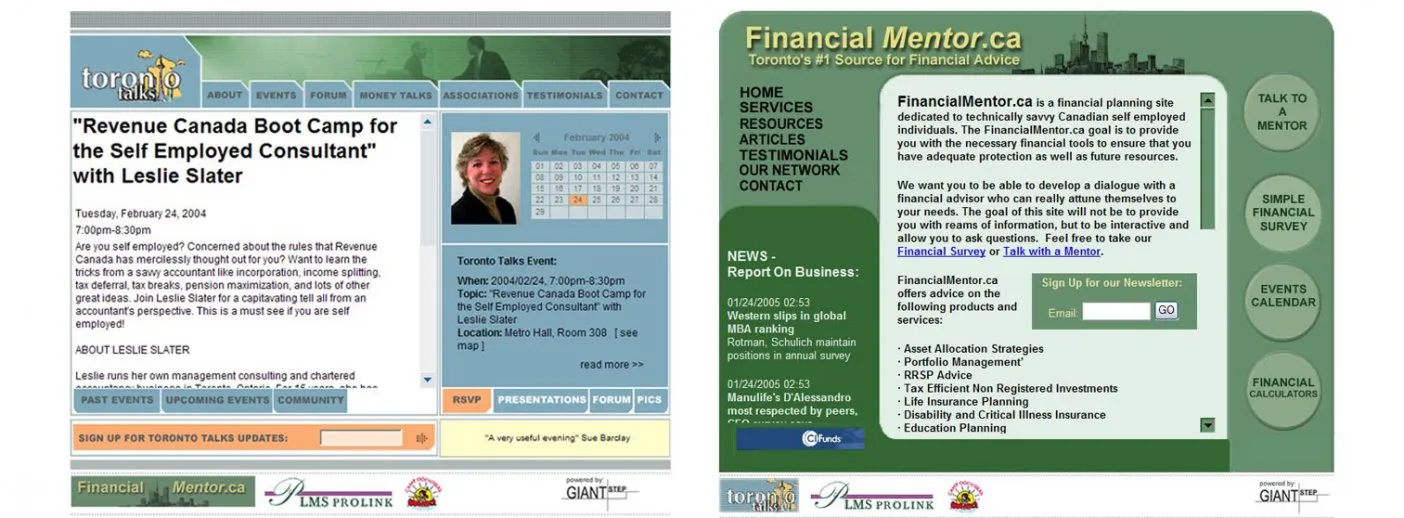 Web Presence for Monthly Speaking Series CLIENT TORONTO TALKS / LMS PROLINK LAUNCHED 2004 Visit The Site "Giant Step understood our strategic goals and translated them into successful, technically creative solutions, while supporting us every step of the way" - John Klotz, Chair, Toronto Talks HIGHLIGHTS * Digital Marketing for a monthly business event * 50-100 attendees/month for over 8 years running * Custom Content Management System (CMS) * Online calendar, presentations, discussion forum * Email newsletter marketing using ThinData EMS * Digital marketing strategy for financial planners * Produced financial mentoring / resources site * Generating leads through surveys and events * Generating sales for financial service companies ABOUT THE PROJECT Toronto Talks is a speaking series that provides members the opportunity to hear from Toronto's leading experts in the fields of Internet and E-Commerce, Management, Leadership skills, Personal Development and Business Development skills. After three years in operation, Toronto Talks needed a new look and a more functional web site that is more helpful for its growing membership base. While updating the site, the founders wanted to use the latest in digital marketing to generate more leads from the events. Giant Step developed a scalable design for Toronto […]