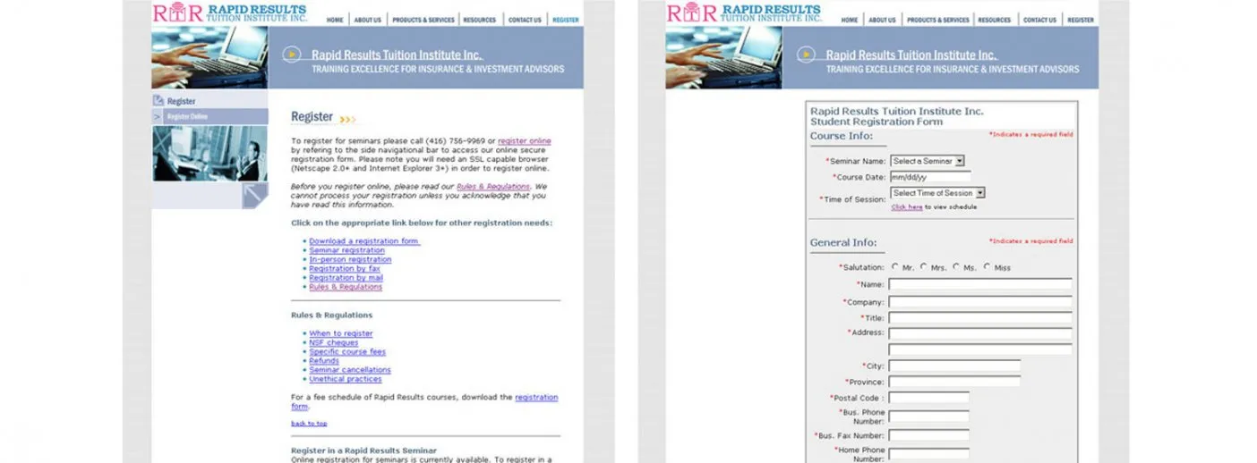 Online Registration For Classes CLIENT RAPID RESULTS TUITION INSTITUTE LAUNCHED 2004 Visit The Site HIGHLIGHTS * Online course scheduling and registration * Training Insurance and Investment Advisors * Custom CMS for course scheduling * Course registration transaction processing ABOUT THE PROJECT Rapid Results Institute specializes in assisting life insurance companies and brokers in meeting their agents' licensing objectives rapidly and cost-effectively. The Rapid Results programs are approved by the Canadian Securities Institute, and prepare students for the Level II Insurance Licensing Examination. An HTML web site was already made, but required HTML knowledge to update the online course schedule. Also, an online registration form was needed to take student applications. Giant Step integrated the online scheduling system into the site, allowing administrators to add courses to the list without any knowledge of HTML. We also customized the online registration system, including a Credit Card transaction system, allowing students to fully register online.