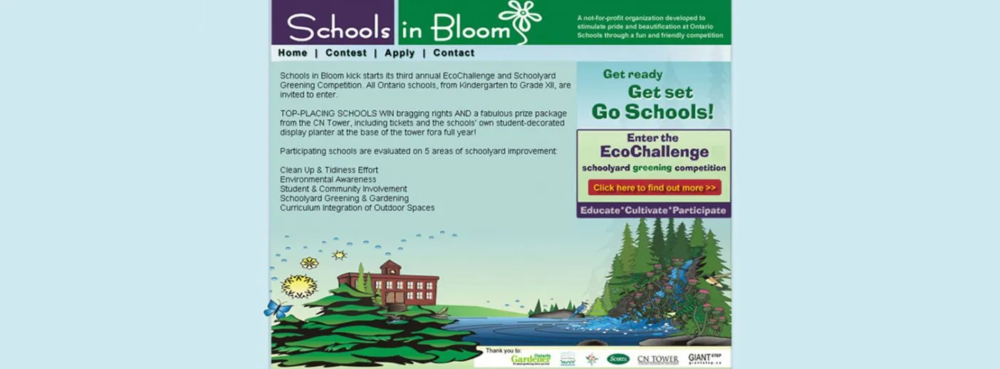 Campaign Site for National Gardening Competition CLIENT COMMUNITIES IN BLOOM LAUNCHED 2004 Visit The Site HIGHLIGHTS * Schoolyard clean-up EcoChallenge * Winners have displays at the CN Tower * Contest Website for applications / publicity