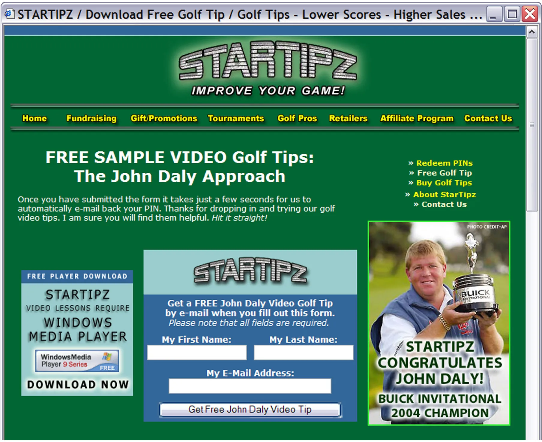 Startipz is an integrated marketing promotion vehicle, designed by Star Digital Media Inc. Affiliate promotional materials, such as trading cards, drink packaging and others, urge people to go to the Startipz web site and enter the pin number on the package to see free steaming videos of sports celebrities giving tips about their golf swing, batting, etc.
