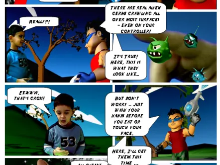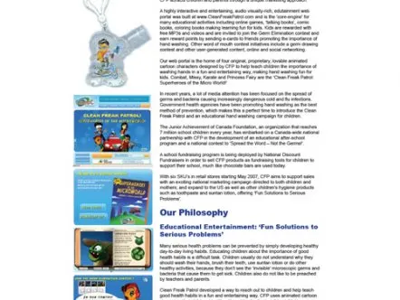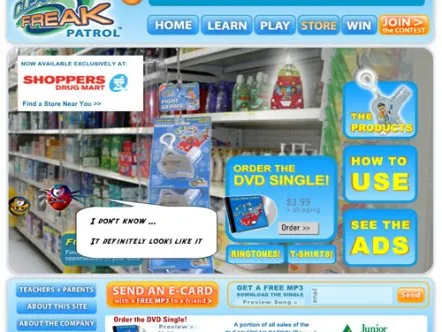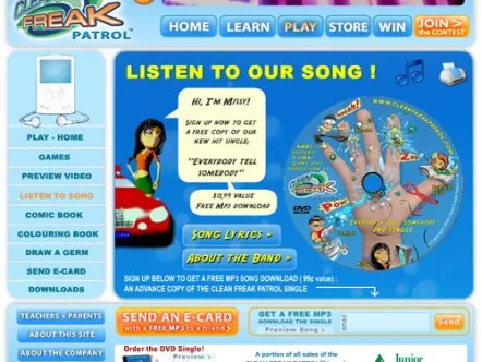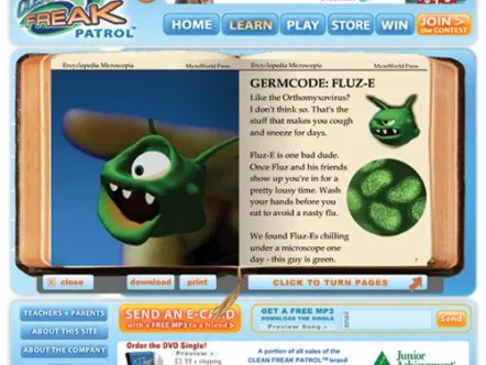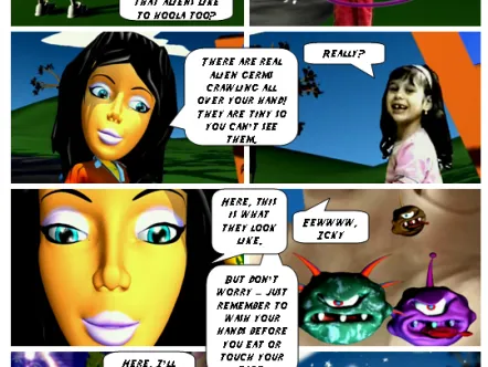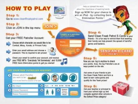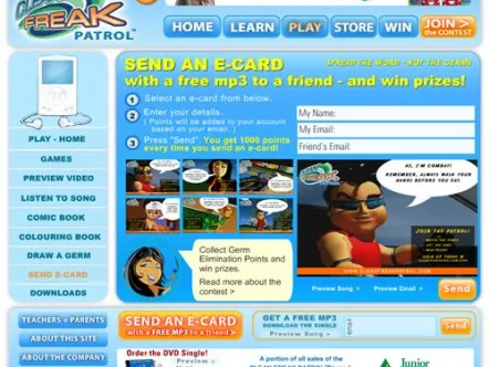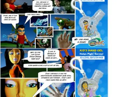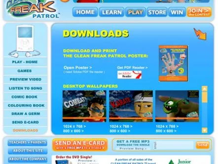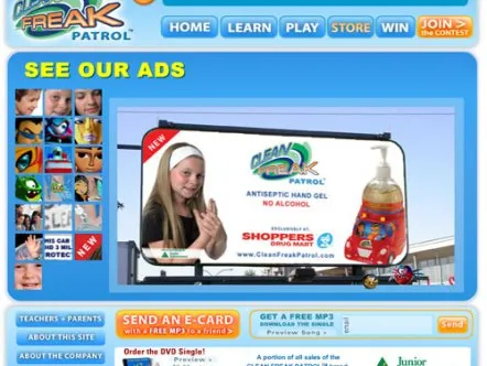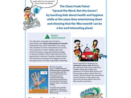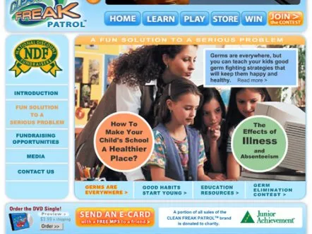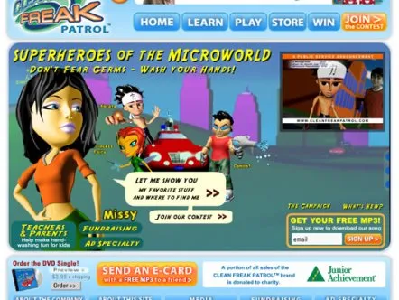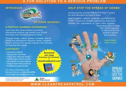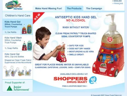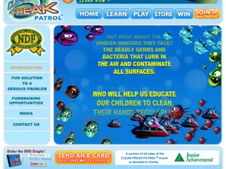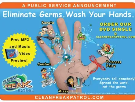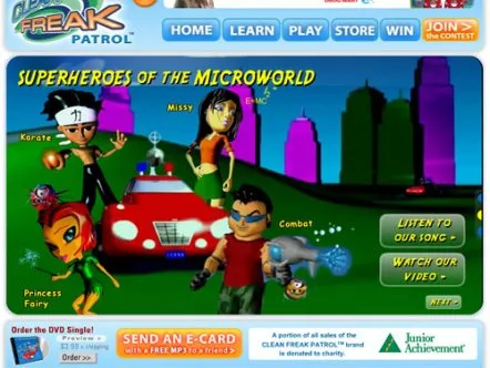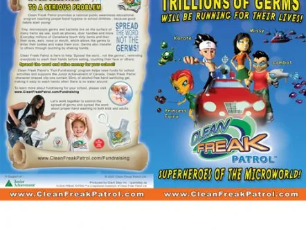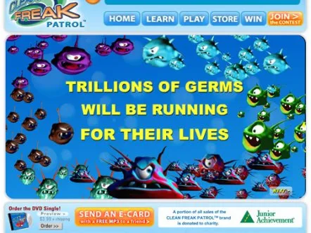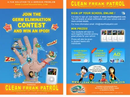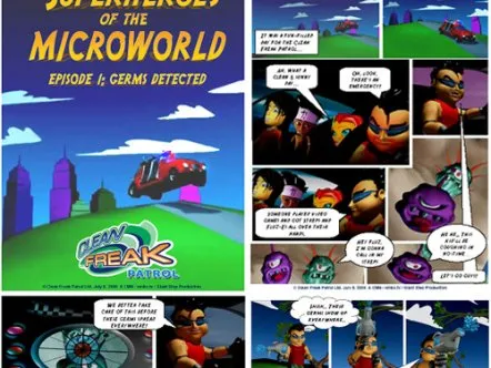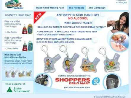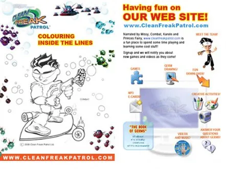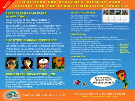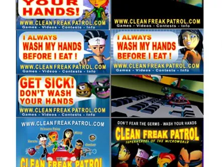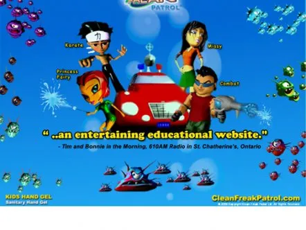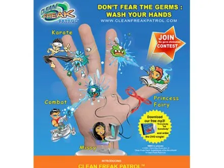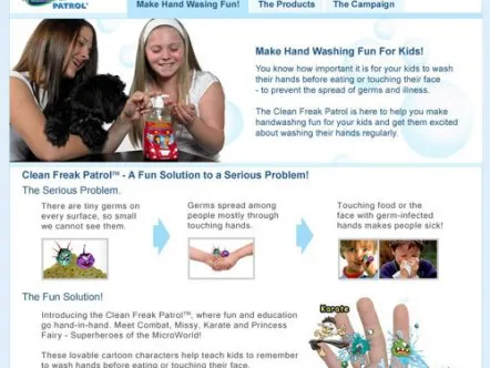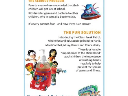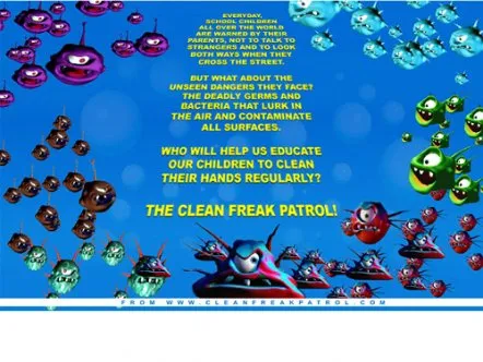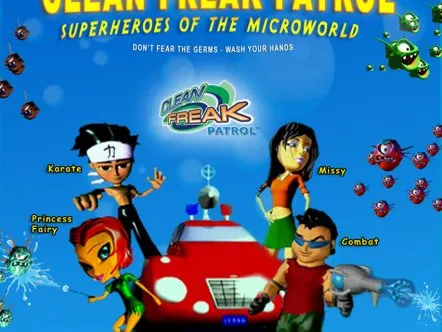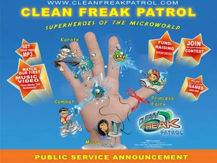 Clean Freak Patrol uses branded educational entertainment content to make hand washing fun for kids. Four animated cartoon characters make up 'Clean Freak Patrol: Superheroes of the Micro World!'. The characters reveal the microscopic, virtually-invisible world of germs and bacteria to children, and equate washing hands to fighting germs through videos, games and activities, thus helping develop healthy habits that prevent the spread of germs and illness.