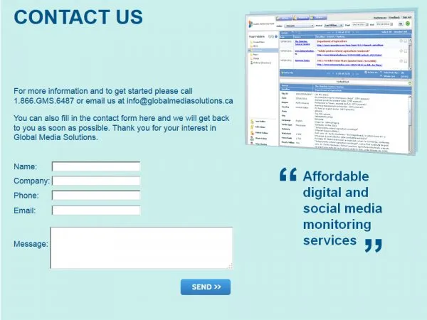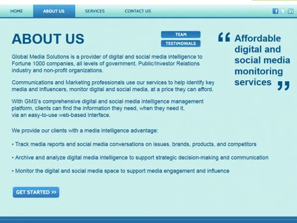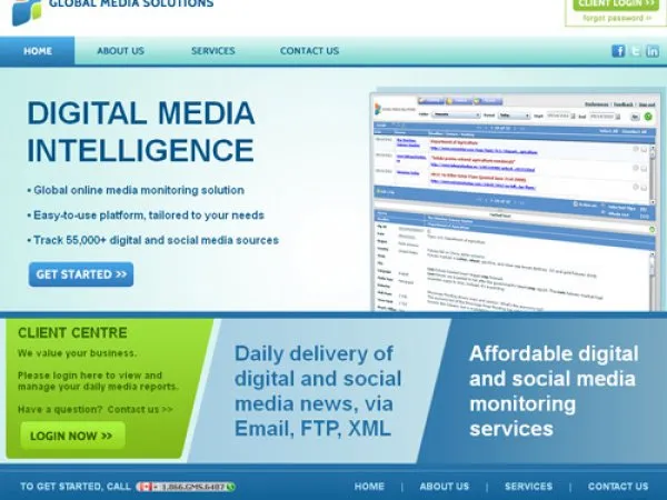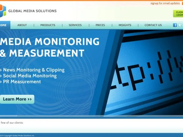 Global Media SolutionsWebsite for Digital Media Monitoring Service CLIENT GLOBAL MEDIA SOLUTIONS LAUNCHED 2011 Visit The Site HIGHLIGHTS * Created the online presence for a digital media monitoring service * Corporate identity + logo design