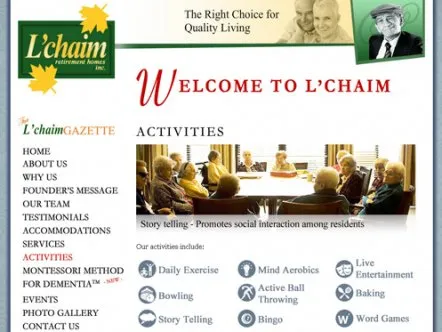 L’Chaim Retirement HomesWeb Site for Retirement Home CLIENT L'CHAIM RETIREMENT HOMES LAUNCHED 2011 Visit The Site