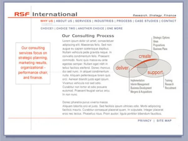 RSF InternationalWebsite for a Management Consulting Firm CLIENT RSF INTERNATIONAL / BENNINGTON GROUP LAUNCHED 2004 HIGHLIGHTS * Web presence for management consultancy * Simplifying complex processes visually * Representing several corporate CEOs