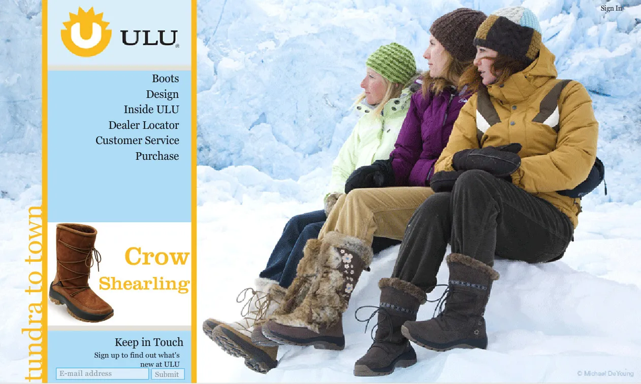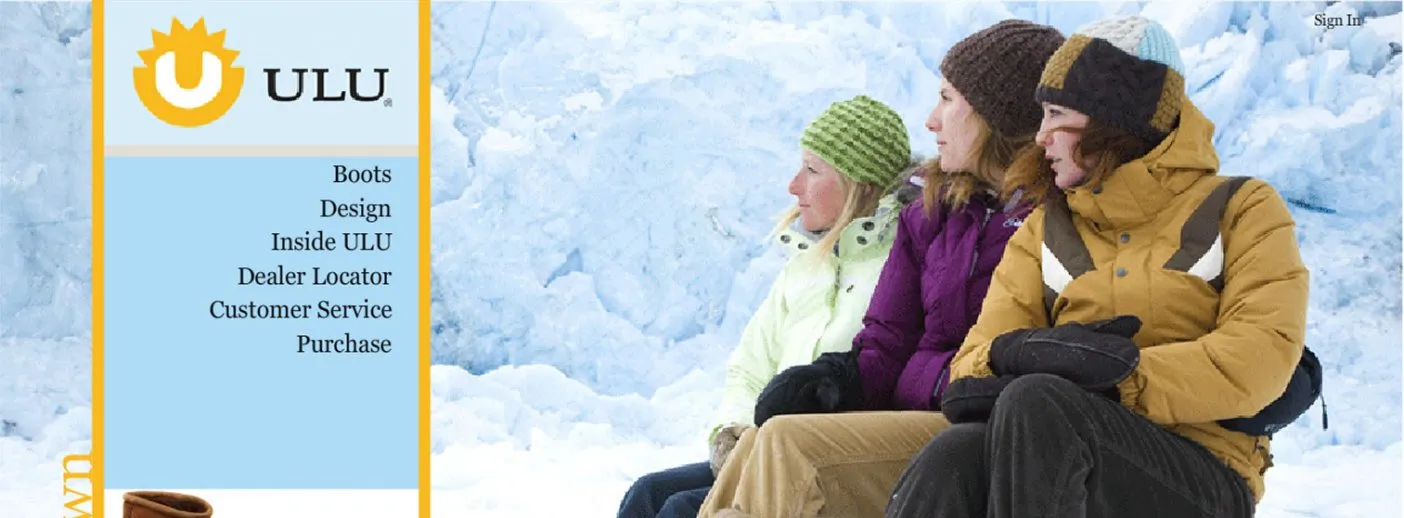 ULU BootsWebsite Updates for Boots Brand CLIENT KEYORA (for ULU BOOTS) LAUNCHED 2008 Visit The Site HIGHLIGHTS * Updated consumer site at uluboots.com * Visuals and Flash animation