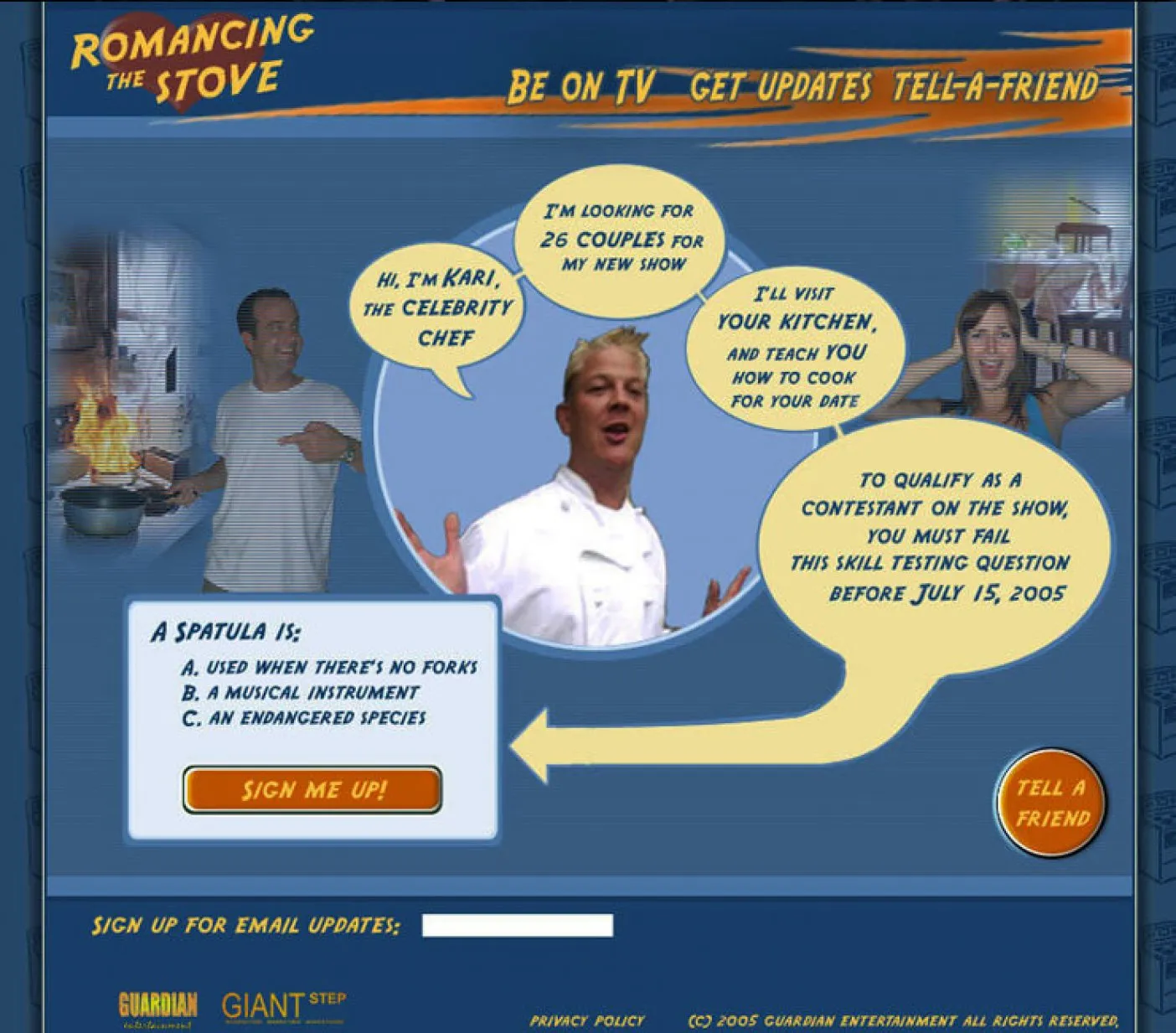 TORONTO, ON, December 26, 2005 —Giant Step has launched www.romancingthestove.ca, an online promotion for ‘Romancing the Stove’, a concept for a reality TV show proposed by Guardian Entertainment.